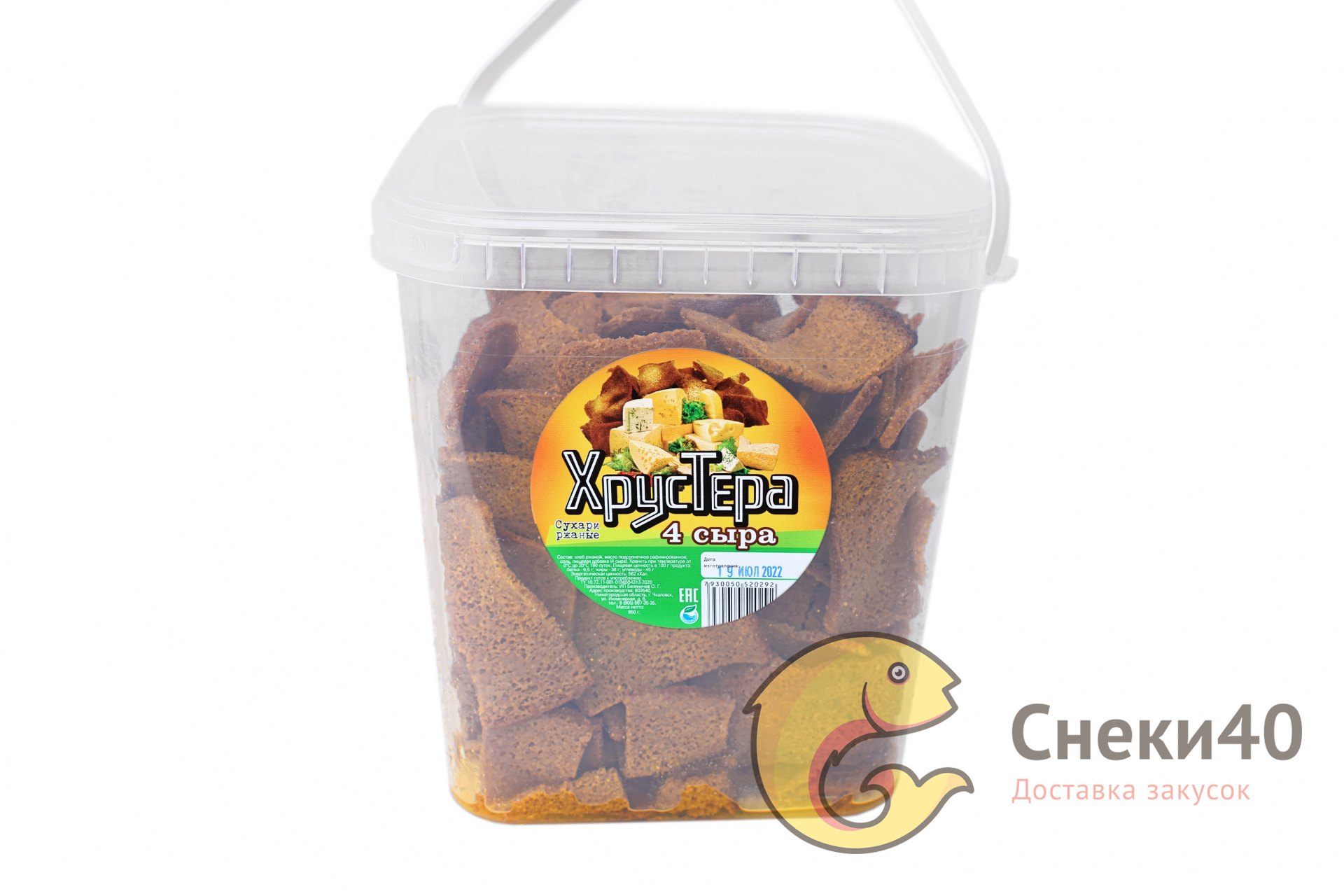 | Состав: хлеб ржаной, масло подсолнечное рафинированное, соль, пищевая добавка (4 сыра). | |