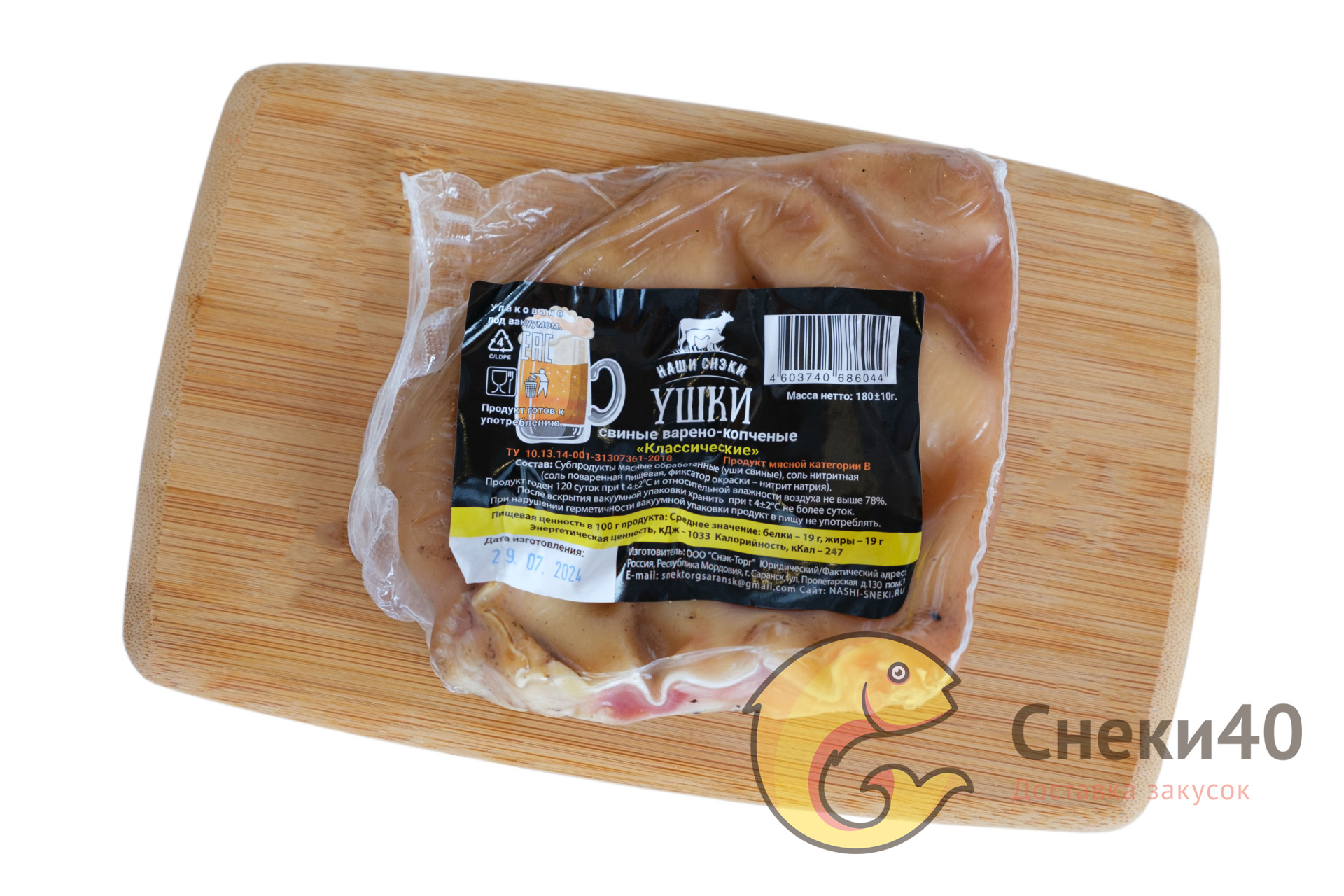 Свиные уши "Наши снэки" цельные варено-копченые 180г